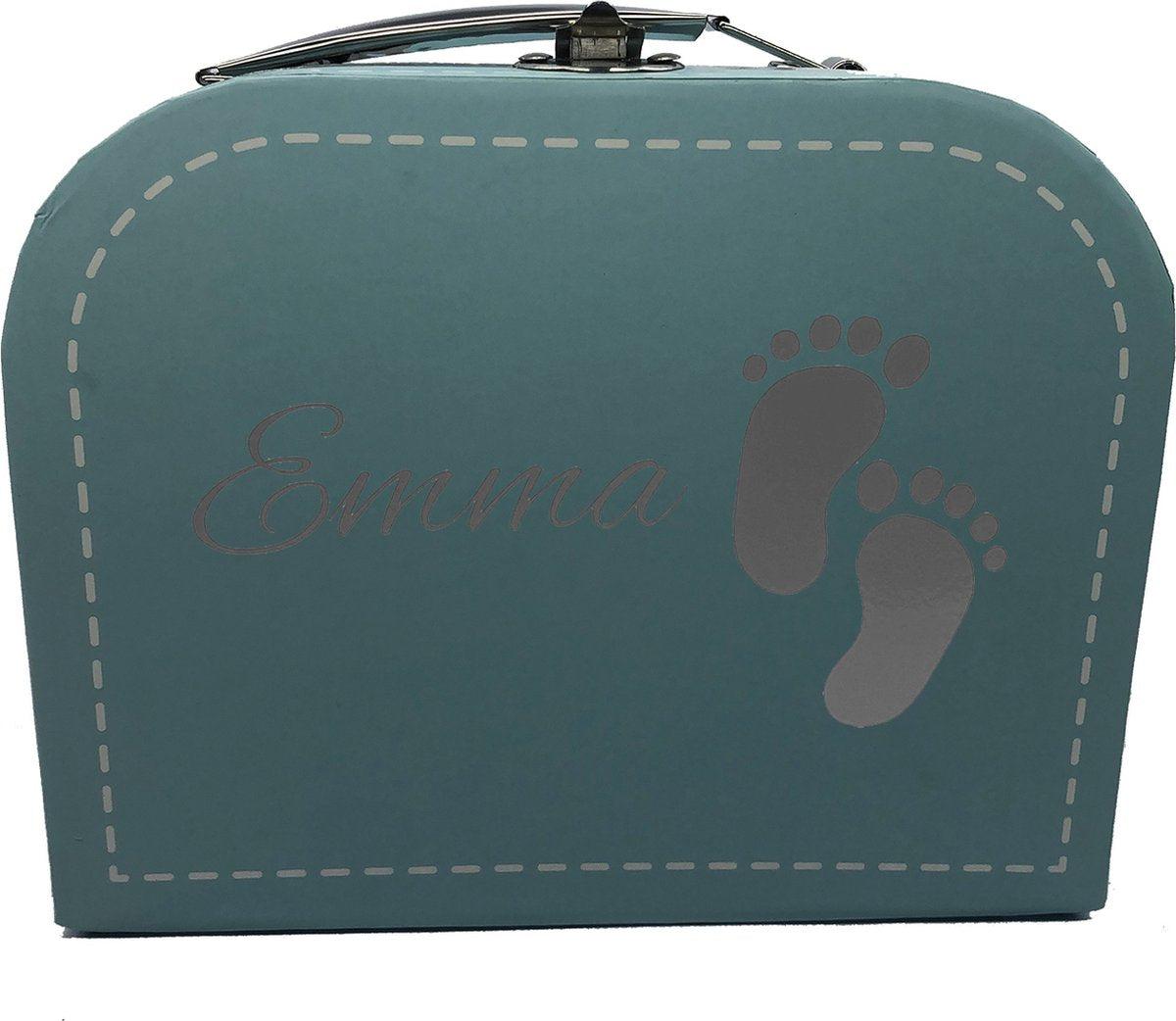 Een echte eye-catcher! Dit blauwe koffertje met rompertje ‘Mijn eerste kerstfeest’ is een prachtig en persoonlijk cadeau. Personaliseer met een naam of een tekst met voetjes, uitgevoerd in een kleur naar keuze. Perfect als uniek kerstcadeau voor baby’s.
