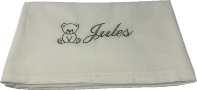Het lakentje wordt gepersonaliseerd met de naam van de baby en een schattige afbeelding van een beertje. Liever geen beertje? Geen probleem! Je kunt zelf aangeven welke afbeelding je leuk vindt, en welke kleur garen om te borduren. Dan doen wij ons best om jouw wens te realiseren.